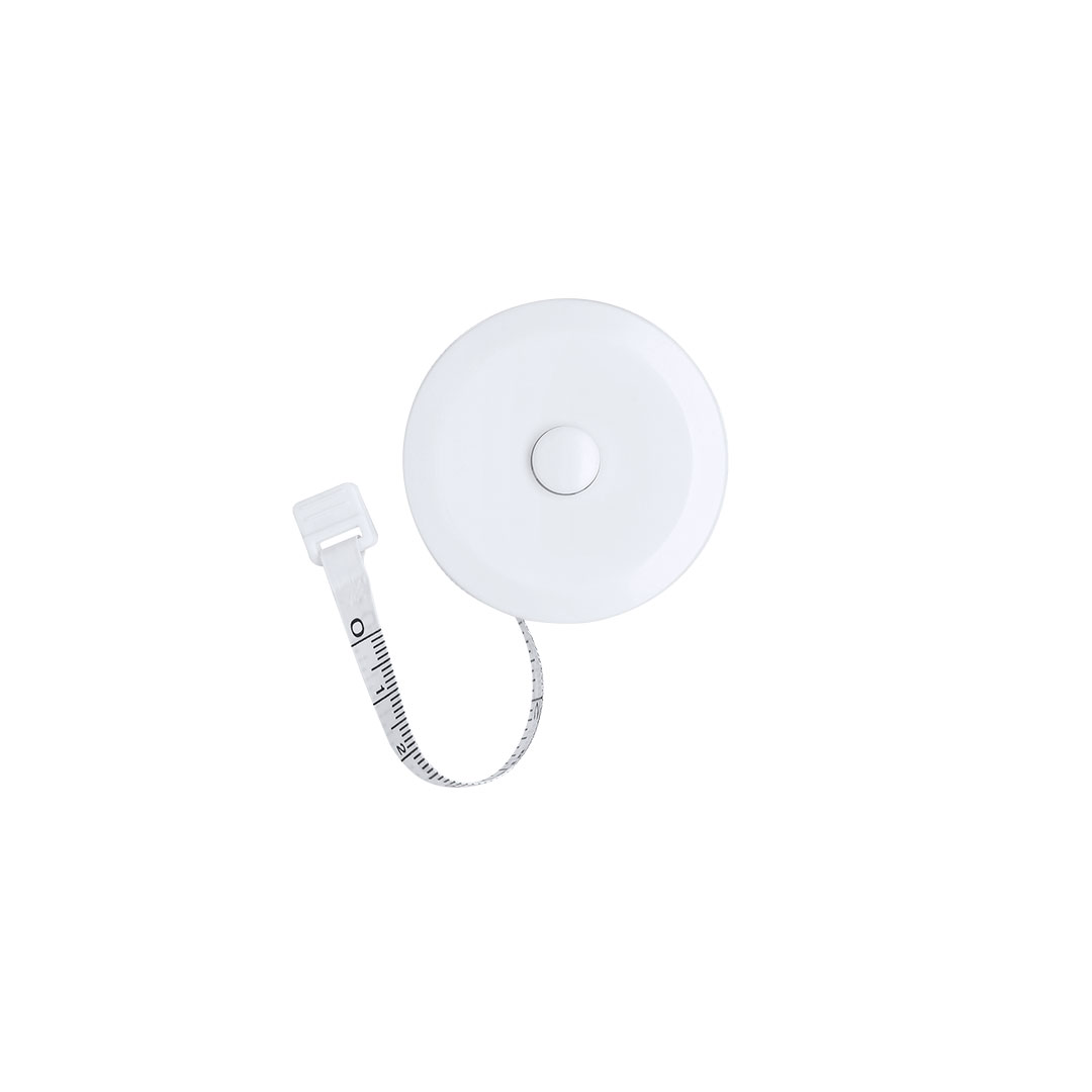 Cinta métrica de PVC de 150cm de largo y mecanismo retráctil con botón de parada. Escala impresa en color negro de cm y pulgadas. Cinta 150 cm