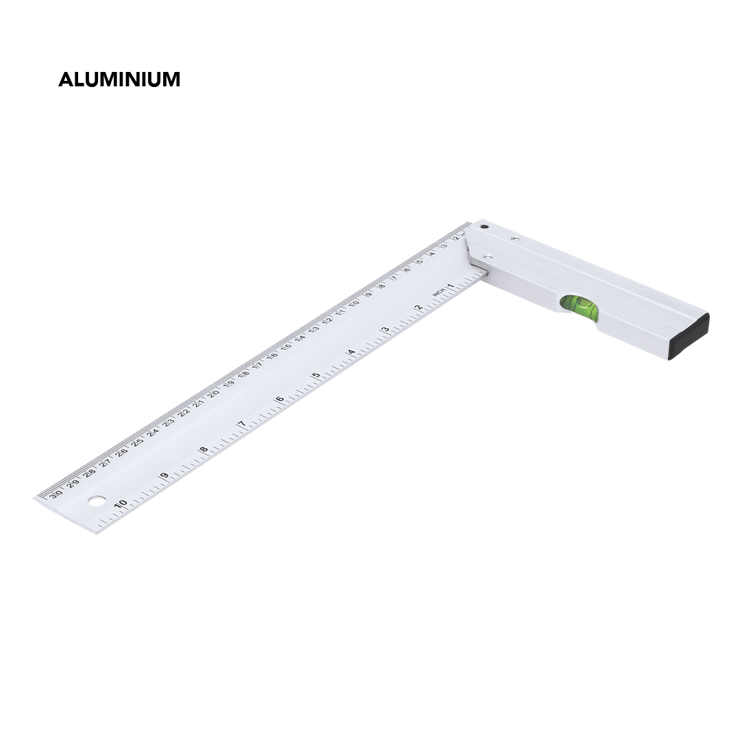 Escuadra en forma de L, fabricada en aluminio, con una longitud de 30,5 cm y medidas en pulgadas de 10,5”. Diseñada con una empuñadura que incorpora un nivel y un práctico agujero para colgar, facilitando su almacenamiento. 30,5 cm y 10,5"